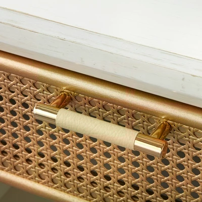 - Modern contemporary design detailed with gold finished rattan door fronts
